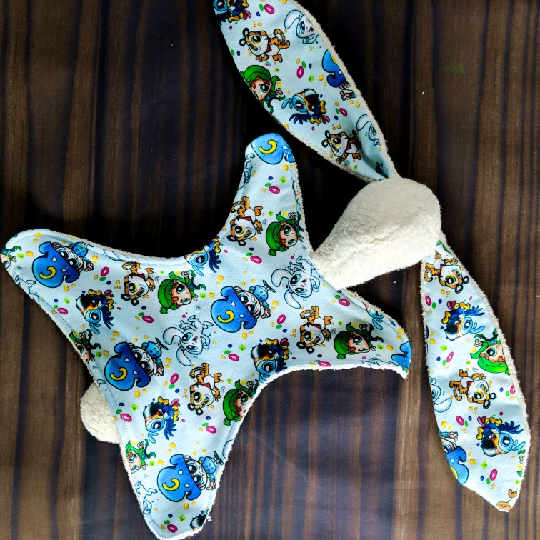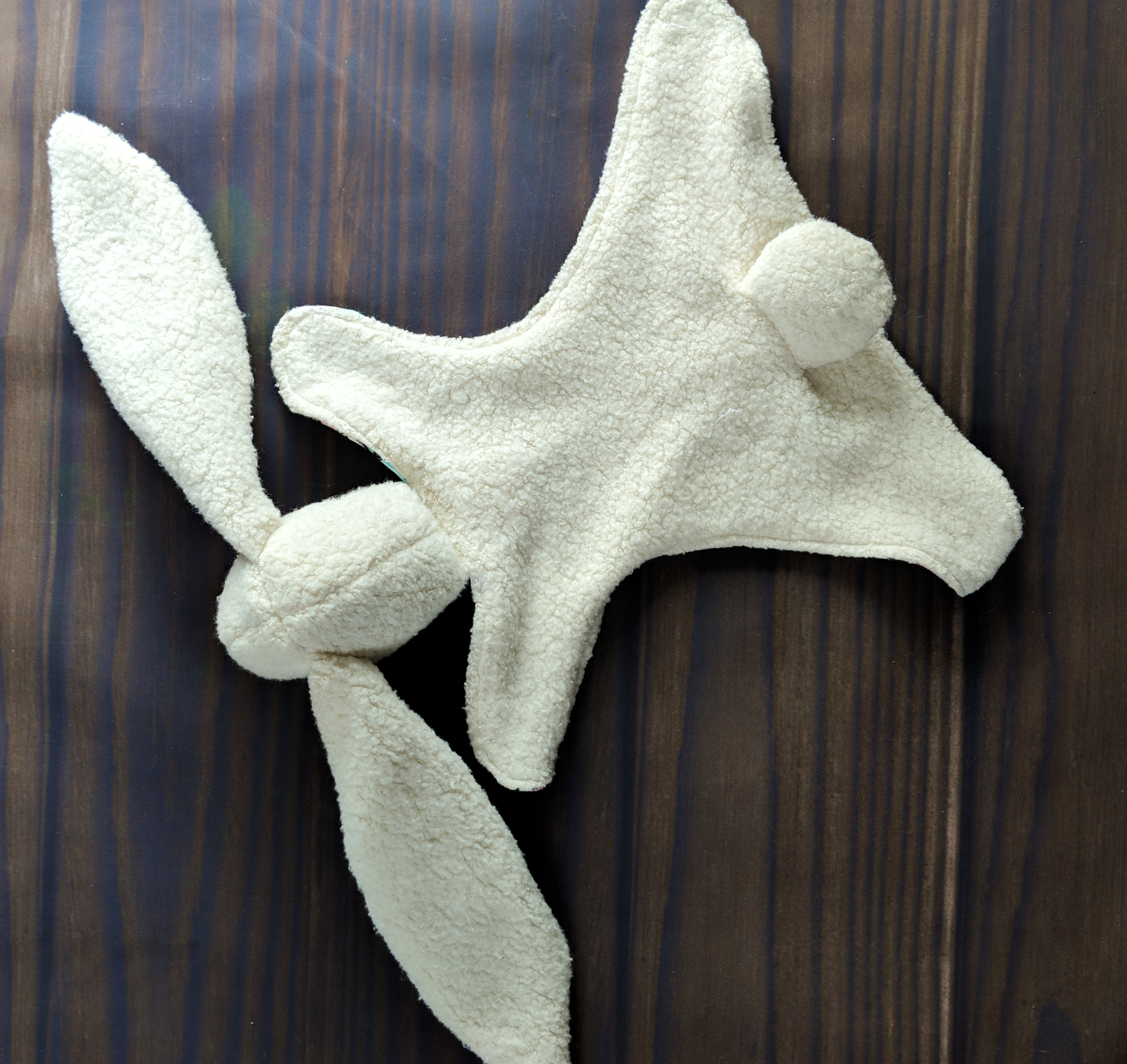 Cotton lyrca print Natural cotton Sherpa back, face, tail. 100% polyester Polly fill stuffing.