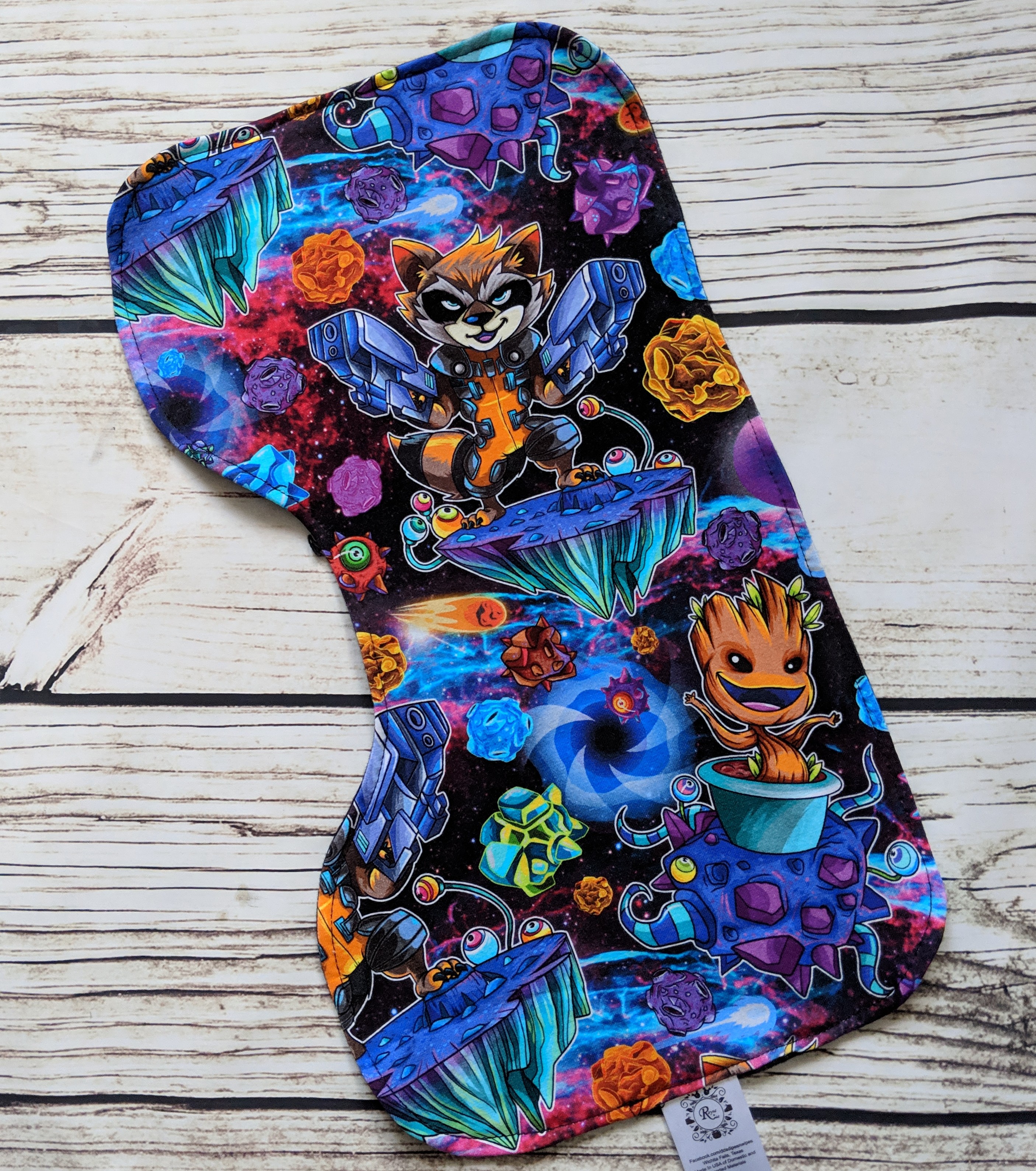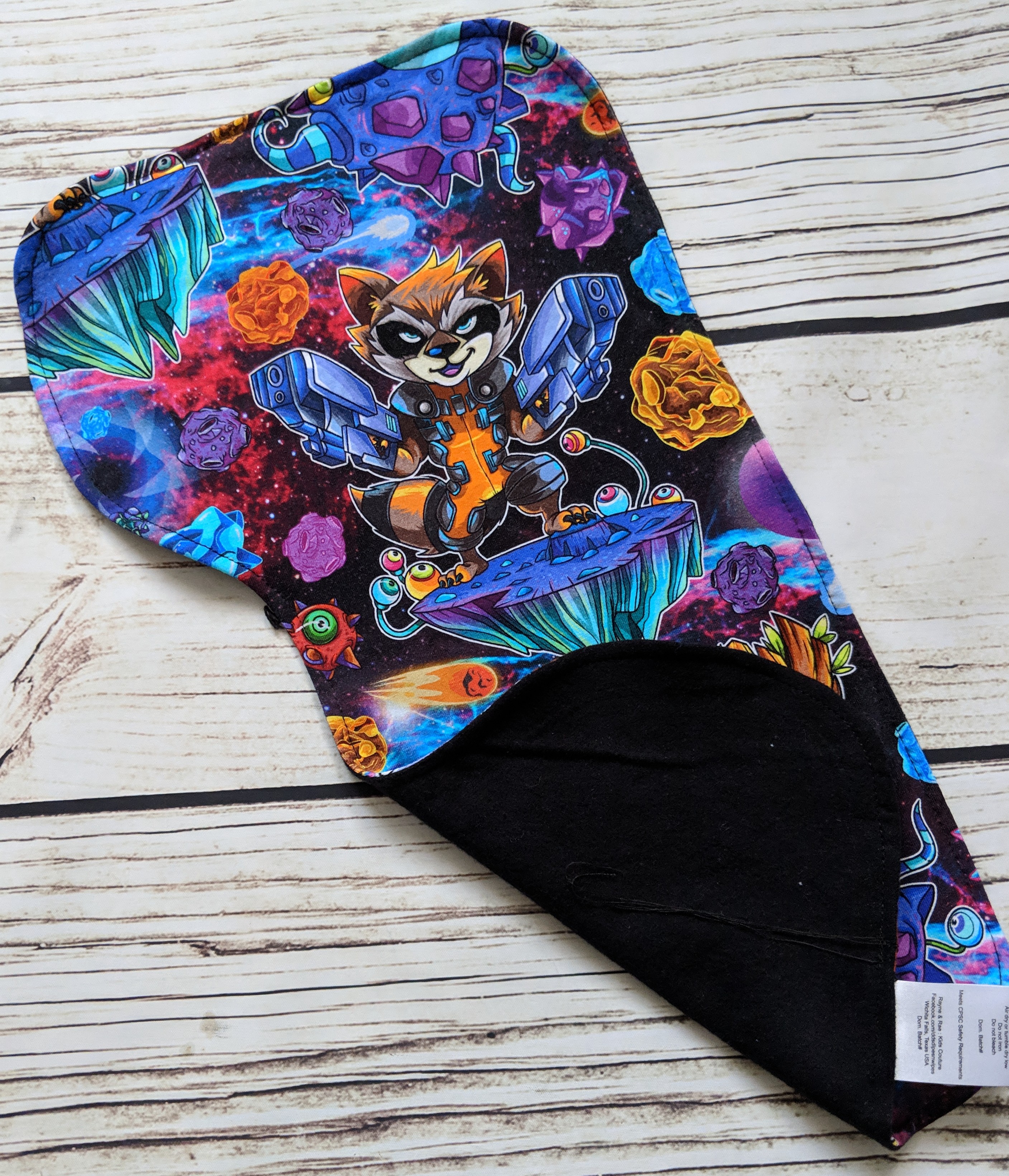 Cotton lyrca print Flannel backing Reversible Curve allows for comfort and ease of placement on shoulders. Doubles as a lap mats! Perfect for keeping crummies off the group or out of the car seat!