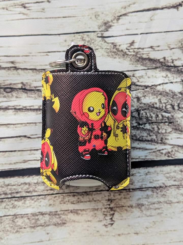 sanitizer holder is made of faux leather with a felt backing and faux leather/vinyl pocket, key ring included. sanitizer bottle not included.