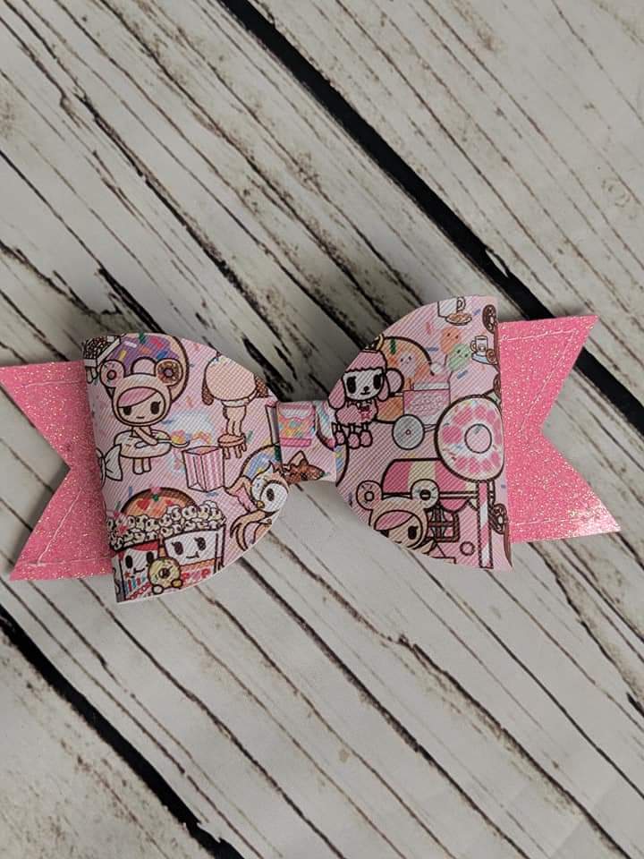 Composed of faux leather/vinyl and felt. This bow has an barrette clip. Perfect to spruce up any pigtail! Measures roughly 5.5 inches wide